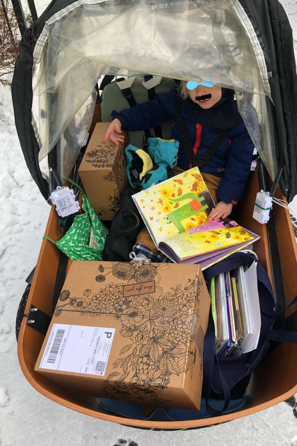 I like to keep my bike organized. I generally keep the front box open for kids and try to store bags and supplies on the rear. Of course that’s sometimes wishful thinking…case in point: