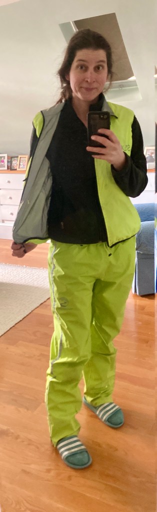 Rain pants are one of my top recommendations to success for winter riding. And if you’re going to wear extra pants, you might as well make them bright!