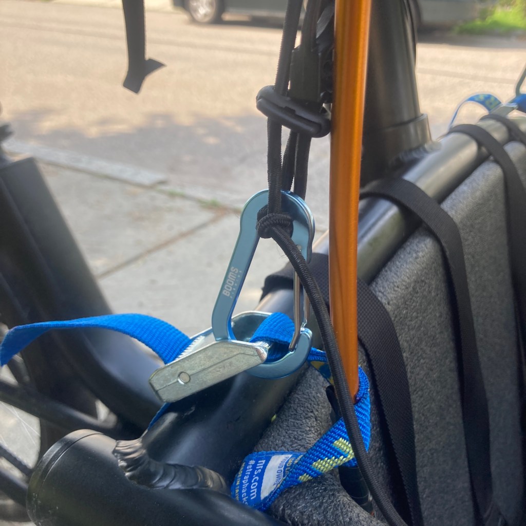 The supplies I used are: a kayak canopy (the canopy comes with support poles, cover, three bungee cords, and three plastic clips), electrical tape, three 1′ cargo straps, and three carabiners.