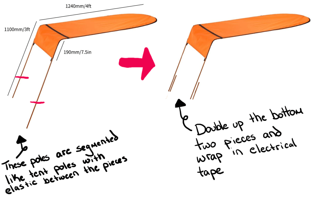 Next, you need to add a brace to your frame to create a convex top. I used an H bracket because I had one hanging around from a lawn sign. I did wrap my frame in clear packing tape underneath the H bracket to prevent excessive scratching. I then wrapped the ends of the bracket around the Pop Top frame, ziptied it in place, and covered the ends in electrical tape so they weren’t so pokey, and voila! It worked great.